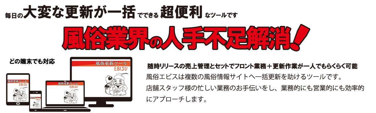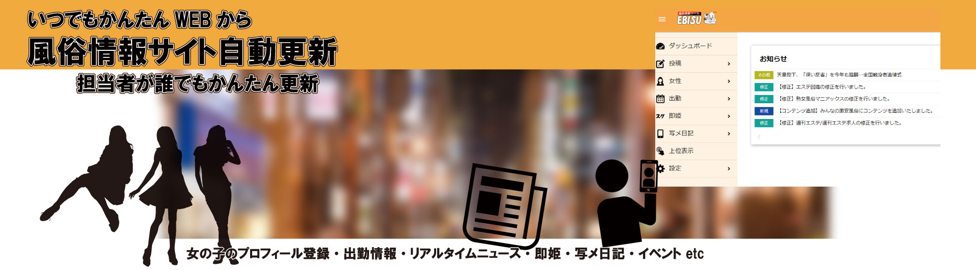 風俗エビスは複数の風俗情報サイトへ一括更新を助けるツールです。店舗スタッフ様の忙しい業務のお手伝いをし、業務的にも営業的にも効率的にアプローチします。
